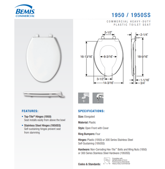 Size: ElongatedMaterial: PlasticStyle: Open Front with CoverRing Bumpers: FourHinges: Plastic (1950) or 300 Series Stainless Steel Self-Sustaining (1950SS)Hardware: Non-Corroding Hex-Tite™ Bolts and Wing Nuts (1950) or 300 Series Stainless Steel Hardware (1950SS) Closing: softy closingRegular price $50.00 -